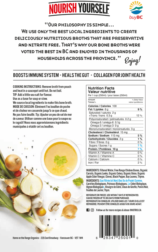Voted Vancouver's #1 favourite Chicken bone Broth by an independent panel!! Our 100% chicken broth comes in a 650mL pouch that is usually frozen and is prepared by our kitchen team. ...